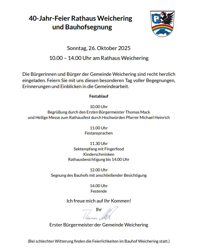 Gemeinsam möchten wir das 40-jährige Bestehen des Rathauses sowie die Bauhofsegnung mit einem Tag der offenen Tür feiern.